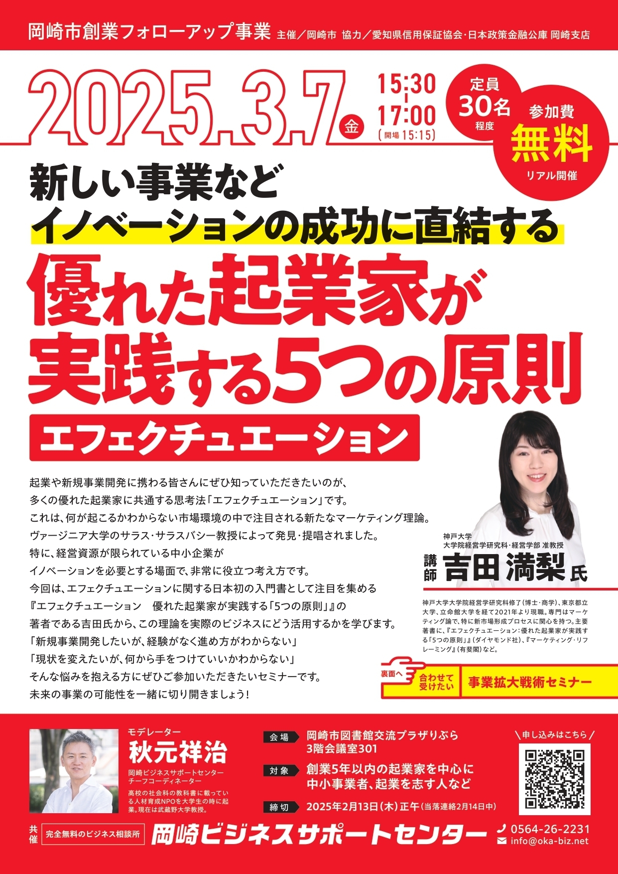 岡崎市は、創業5年以内を中心とした事業者・起業家向けに、今大注目の起業理論「エフェクチュエーション」著者の吉田 満梨氏(神戸大学准教授)を招いたセミナー「優れた起業家が実践する5つの原則」を開催します。セミナーでは、従来の目標設定型ではなく、事業者が今ある資源を活かして事業を拡大させていく経営思考法を具体的な事例を交えて学びます。地域事業者が不確実性の高い現代社会に求められる新しい経営思考にアップデートしてもらうことが狙いです。なお、当セミナーは「岡崎市創業フォローアップ事業」連続講座(全5回)の一環として開催します。(運営:岡崎ビジネスサポートセンター・オカビズ(センター長:高嶋 舞/受託 株式会社やろまい))