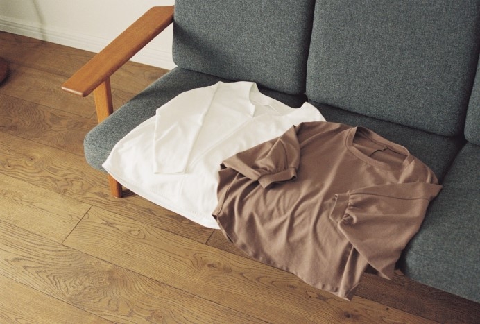 “抽出後のコーヒーの粉” を原料としたサステナブルなアイテム。ほどよく厚みがあって、さらりと肌になじむ素材。秋の新生活に向けた着回しトップス。