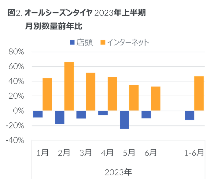 近年販売が増加しているオールシーズンタイヤは数量前年比21%増と二桁成長を見せた。店頭、インターネット別にみると、インターネットでは47%増と大きく伸長したものの、店頭では12%減と販売を落とした(図2)。