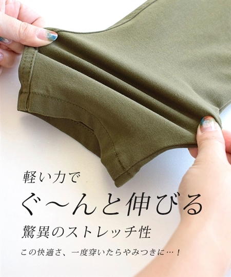 また、吸いつくようにピッタリとフィットし、フロントや腰回りのデザインはスッキリとさせています。生地感も薄手であることから、チュニック丈のトップスやワンピースの下、ロングスカートの下などに重ねやすく仕上げています。