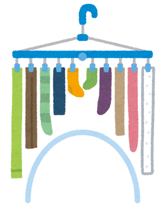 洗濯ハンガーの外側から内側に向かって、丈の長いものから短いものを干していきましょう。イラストのようにアーチ状に干すことで、内側に風(空気)が通るスペースができて乾きやすくなります。水分が蒸発しにくい綿素材は外側、乾きやすい化繊素材は内側、のように素材によって分けるのもよいでしょう。