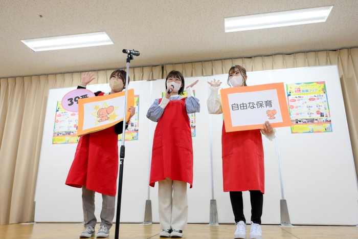 フェアに参加する各園の現役の先生が趣向を凝らした演出で、30秒という限られた時間を使い、保育方針や内容・園の魅力や特徴をアピールします。「ブース選定の参考になって分かりやすい」と毎回学生から声をいただく大好評企画です。