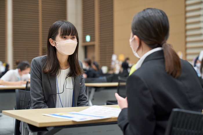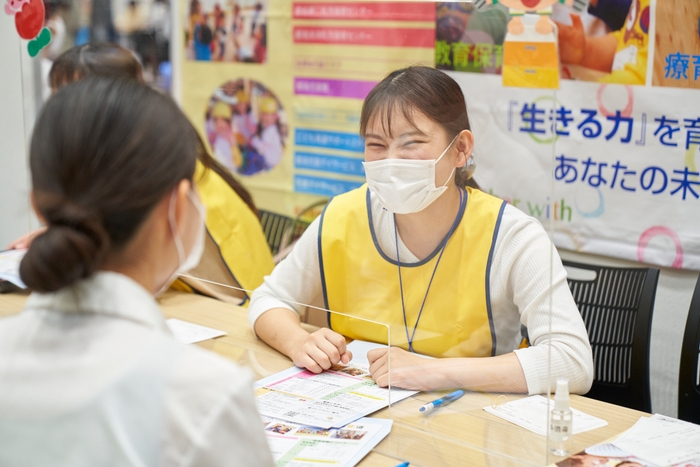 出展法人には当社より、できる限りブースには若手キャリアの先生を配置いただくように依頼。学生との年齢が近く、学生の悩みや本当に聞きたいことをよくご存じだからです。話しやすい先生方とコミュニケーションをとり、より深く現場のことを理解し、働きがいを感じられる進路選びをしてもらいたいと考えています。