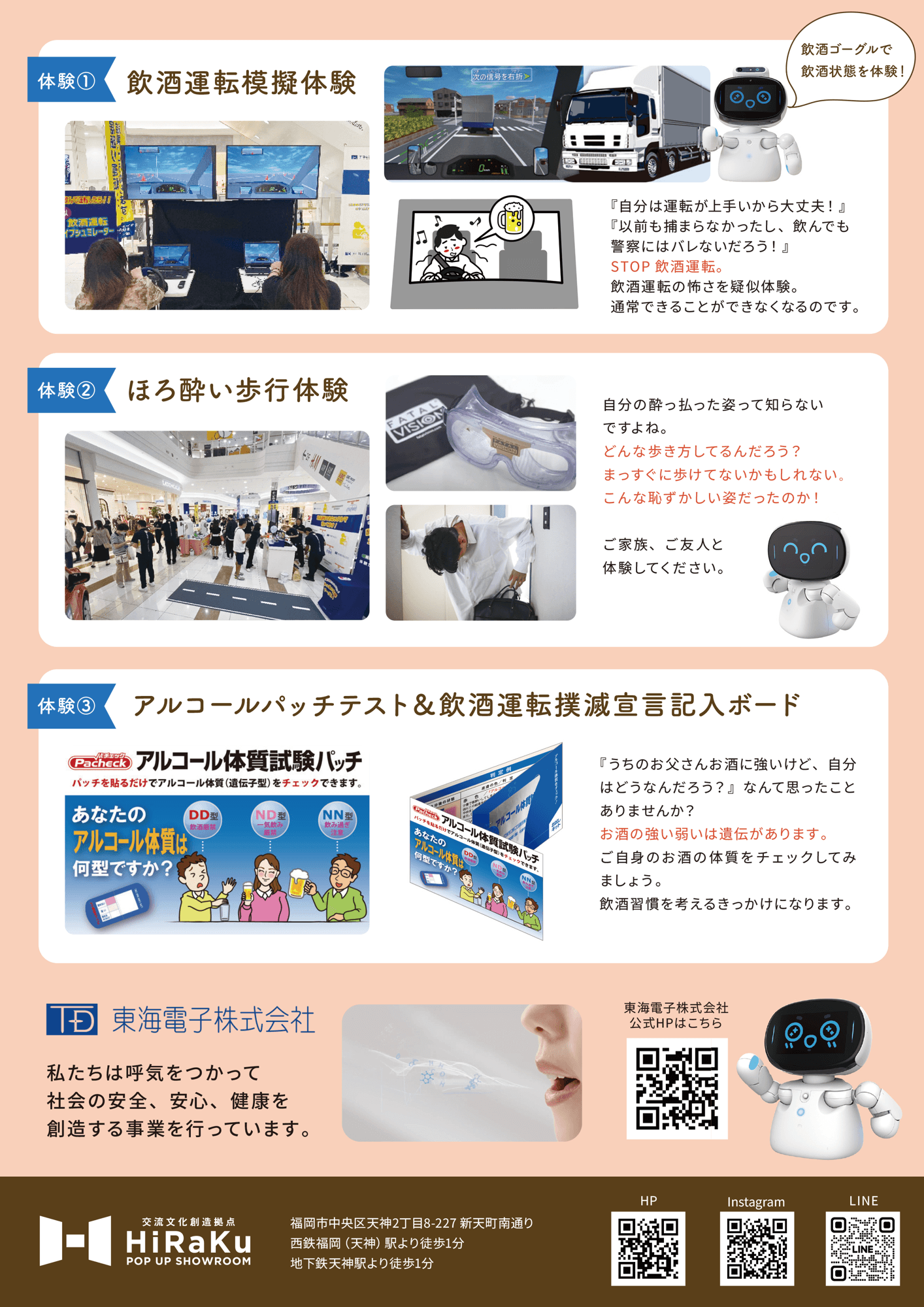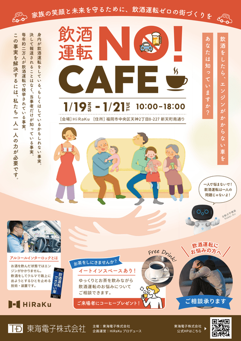 アルコール問題に対する社会的な取り組みを推進する東海電子株式会社(本社:静岡県富士市 代表取締役:杉本 哲也)は、2025年1月19日(日)から21日(火)に、福岡市で「飲酒運転NO!CAFE」イベントを開催いたします。開催各日において福岡県警中央警察署にお越しいただき、飲酒運転通報訓練と自転車の法改正についてご説明いただくことが決定いたしました。