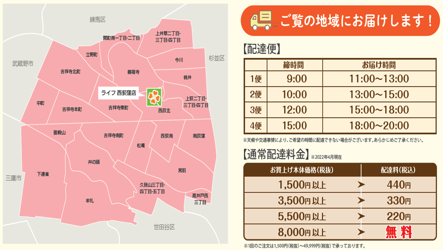 “おいしい” “ワクワク” “ハッピー” をお届けするライフコーポレーションは、9月28日(水)より東京都杉並区の「ライフ西荻窪店」で「ライフネットスーパー」のサービスを開始いたしました。