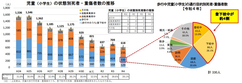 児童の死者・重傷者は歩行中の割合が高く、歩行中児童の死者・重傷者のうち登下校が約4割を占めていて、こどもを始めとする歩行者の安全確保は重要なポイントです。