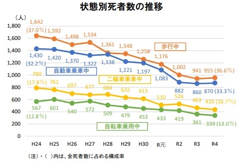 交通事故死者数の推移をみてみると、歩行中の割合は例年最も高くなっています。