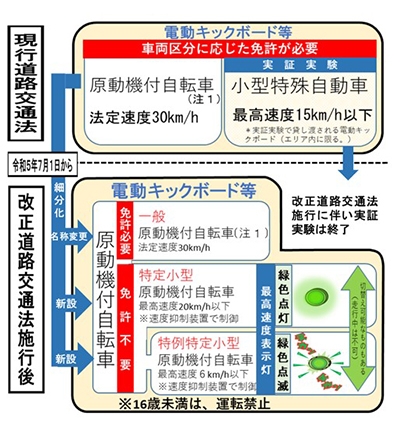 近頃街中でも見かけるようになり、普及が進んでいる電動キックボードですが、2023年7月より一定の基準に該当する電動キックボード等について、原動機付自転車の一類型である「特定小型原動機付自転車」が創設され、運転免許が不要になる等の新しい交通ルールが適用されます。