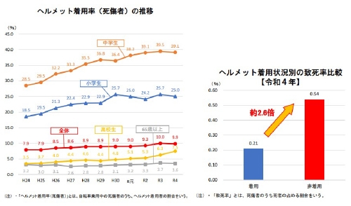 幼児や小学生に比べ、大人の着用が少ない印象ですが、ヘルメット着用時より非着用時の事故での死亡率は約2.6倍に跳ね上がっており、ヘルメットの必要性がお分かりいだだけるかと思います。
