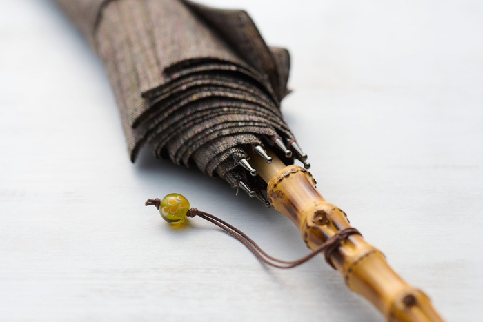 骨は昔ながらのスチール製の10本骨仕様。10本骨は、一般的な8本骨よりも丸みのある形が特徴です。スチール製の骨は、硬さのある麻生地をしっかりと支え、傘を閉じた時も開いた時も美しいシルエットを生み出し、レトロな樫の木の中棒が風情ある佇まいを演出します。手元できらりと光るのは、手作りのガラスのトンボ玉。※トンボ玉の色はおまかせです。