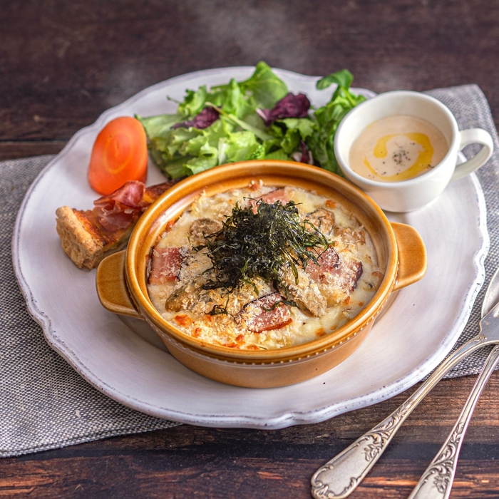 「糸島カキとスモークベーコンのドリア 生ハム・アスパラガスのキッシュプレート」