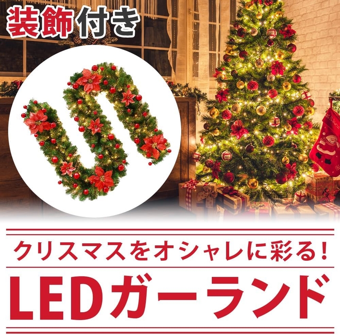 クリスマスの雰囲気をより一層引き立てるガーランドは、赤を基調としたボールや花があしらわれています。予め装飾がモールにくっ付いているため、自分で貼り付ける作業は一切不要。お手元に届き次第すぐにデコレーションに取り掛かれます。窓・ドア・壁・階段の手すりなどアイディア次第で様々な場所の飾り付けにお役立ていただけます。