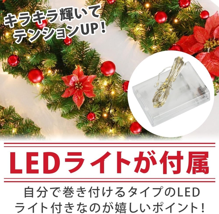 円形・四角形・ハート・波状など飾る場所や雰囲気に合わせて調節できます。モールの他に、暗闇で幻想的な空間を生み出すLEDライトも付属します。細かな電球が付いたロープタイプなので、モールに巻き付けるだけでセット完了です。LEDライトは電池式によりコンセントの場所を気にせず、コードレスで使えるところもポイントです。