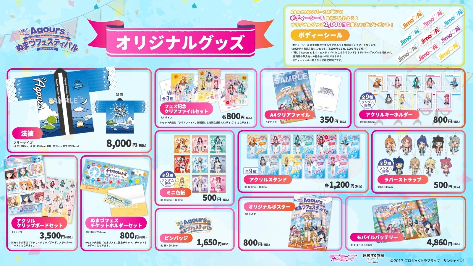 本イベント限定描き下ろしイラストも使った、オリジナルグッズ全12種を販売いたします。オリジナルグッズを合計2,000円(税込)以上お買上げの方に「ボディーシール」もプレゼント! イベント参加に加え、オリジナルグッズもぜひお買い求めください。