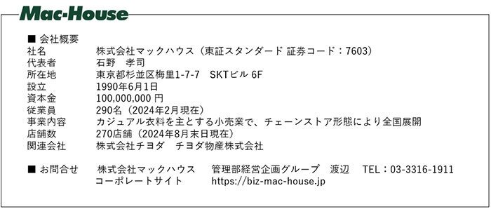 全国270店舗のマックハウス/ネイビーでお買い求め頂けるほか、マックハウスオンラインストアでも販売いたします。