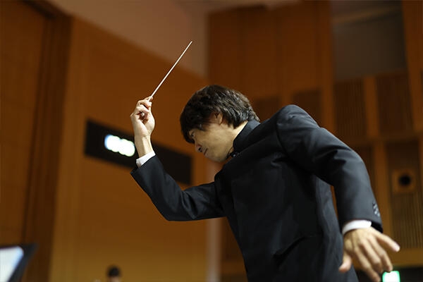 普段の練習場所は、天白キャンパスクラブハウスの地下にある小さな練習室B06。エアコンが設置されていないため、夏場は暑さと闘いながら演奏しなければなりません。扇風機を取り合いながらもなんとか練習に集中し、猛暑をやっと乗り切った秋、定期演奏会本番を迎えます。ステージに並ぶのは、地下の蒸し暑い練習室で頑張ってきた団員たち。指揮者の先生は彼らの努力をたたえ、最大限のパフォーマンスを引き出します。