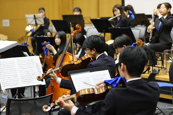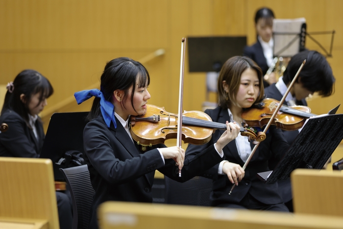 ほかにも新入生歓迎会や卒業式などの学内行事のほか、地域のイベント、保育園や高齢者施設といった外部からの依頼による公演など、年間の演奏活動は多岐にわたります。公演の趣旨や会場規模に合わせ、室内楽などの小編成からオーケストラまで臨機応変に対応し、学内外の多くの人たちを楽しませています。