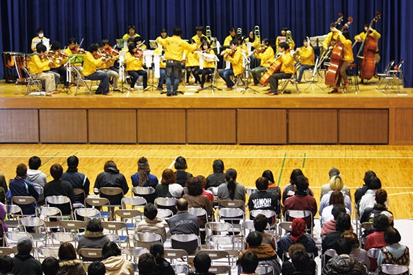 これまでの長い活動の中では、大学をあげての東日本大震災復興支援プロジェクト~よみがえれ大島~にも参画。2012年と2014年に宮城県気仙沼市の小学校で演奏会を開き、被災した地元の方々を音楽で励ましました。