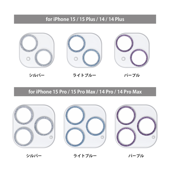 種類は、iPhone15/15 Plus/14/14 Plusの2眼タイプと、iPhone15 Pro/15 Pro Max/14 Pro/14 Pro Maxの3眼タイプの2種類。カラーはそれぞれシルバー・ライトブルー・パープルの3色で展開。