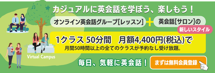 入門者クラスやテーマ別クラスなど少人数グループクラス制、日本人やネイティブ英語講師とのグループ英会話レッスンや英会話サロンにも何時でも自由に参加できます。