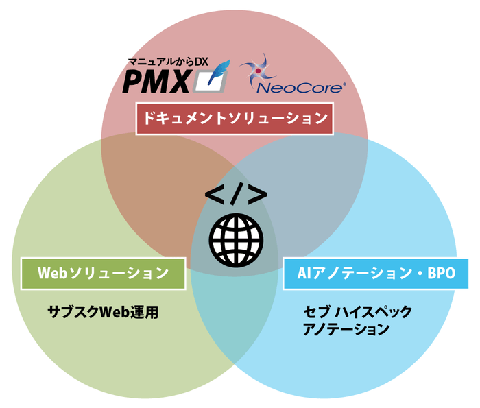 サイバーテックは「AIアノテーション・BPO」事業とともに、創業当初からのWeb技術とマークアップ言語のノウハウをベースに、「ドキュメンテーション事業」「Webソリューション事業」を含めた次の3事業を行っています。