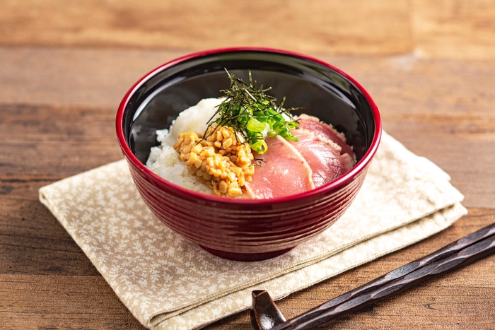 キハダマグロのタタキに、ネバネバの納豆ととろろを合わせました。こちらもわさび醤油の味付けで。
