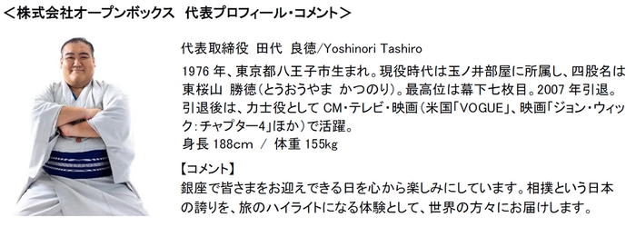 相撲の力強さと和食の美しさ、そして人の温かさが交わるこの空間から、日本の誇りある文化を世界中の人々へ届けてまいります。
