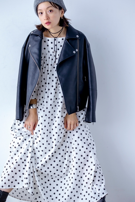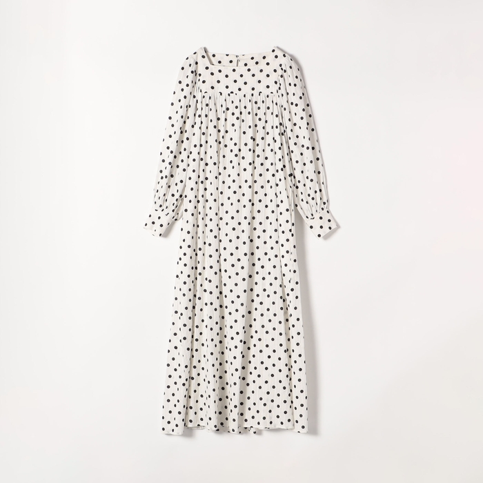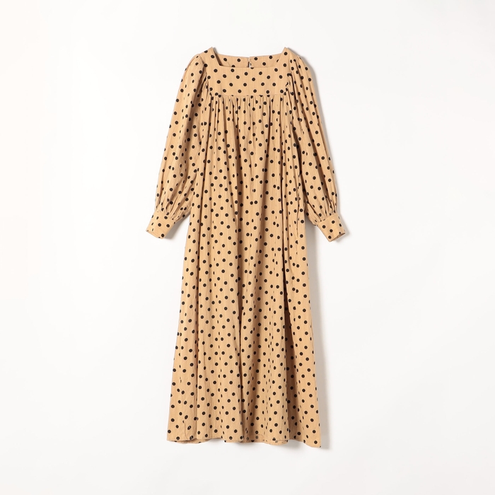 スクエアネックのデコルテラインが大人っぽくて女性らしいドット柄ワンピースです。コンパクトなヨーク切り替えからふわっと広がる袖と身頃の雰囲気と、メリハリのあるシルエットが相まって、大人な可愛いワンピースです。ストライプ状の凹凸感のあるドビー組織のソフトなコットン素材にドット柄プリントを載せることで、より奥行きと立体感のある印象とハンドクラフト感漂う温かみのあるアイテムに仕上がりました。袖をたくし上げてボリュームを出す着こなしや、秋にはブーツと合わせたりして季節ごとの着こなしを楽しめます。ご自宅でお洗濯が可能です。