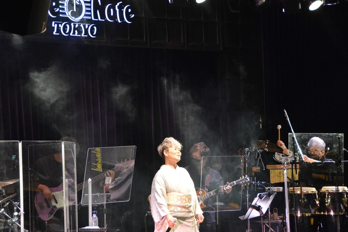 オープニングは、映画「ライオンキング」の挿入歌で、ミュージカルナンバーとしても有名な『Circle of Life』で登場。会場の度肝を抜いた。”カバー”のルーツになったという、つのだ☆ひろの『メリー・ジェーン』や、越路吹雪の『愛の讃歌』を歌いあげた後、「ブルーノート東京」のステージの為に用意したセットリストという事で、ジャズのスタンダードナンバー『LULLABY OF BIRDLAND』や、シルヴィ・ヴァルタンのヒット曲『Nicolas』など、洋楽曲4曲を熱唱。