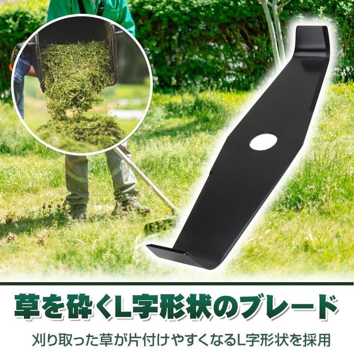 切れ味抜群のシュレッダーブレードを使用することで柔らかな雑草をはじめ、小さな木・枝・竹・ツルも一網打尽!庭の手入れや芝生のトリミングなど様々なシーンで性能を発揮します。両端はL字型の形状により、一般的な草刈り刃よりも刈り取った草が片づけやすい工夫が凝らされています。