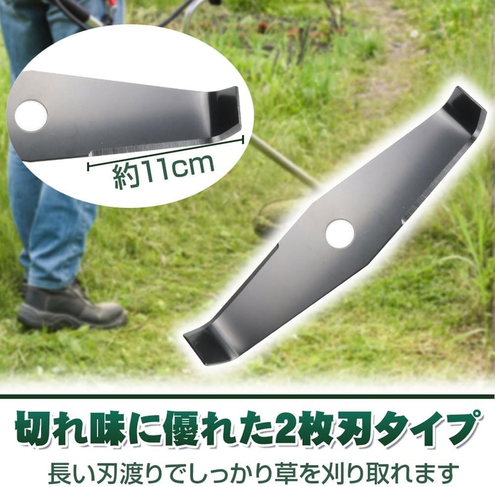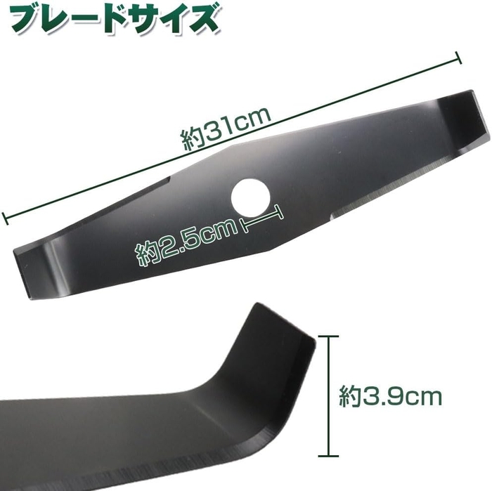 高性能なシュレッダーブレードは対角線に刃が配置された二枚刃仕様。さらに全長約31cm・刃渡り約11cmと長く、時間や手間の掛かる草刈り作業を大幅に短縮できる優れものです。耐久性に優れた素材を採用しており、劣化しにくい点から持続可能で環境への負荷も軽減します。