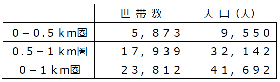 ・店舗から1㎞圏内は単身世帯比率が57.6%、2人世帯比率が21.8%と全体の約8割が少人数世帯です。