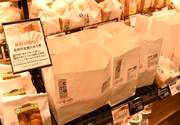 以前の店舗にはなかったインストアベーカリー“小麦の郷”を導入。米粉を100%使用した食パンや専用窯で焼き上げるピザなど、作り立て商品を展開します。