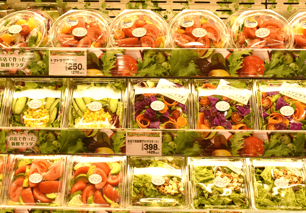 新鮮な野菜を使用して店内で作った色とりどりのサラダが並びます。