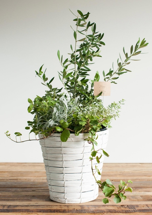 プロが見立てる観葉植物にハーブを寄せ植えた少し感度の高い寄せ植え鉢、見ているだけで思わず元気になってしまうような仕上がりです。