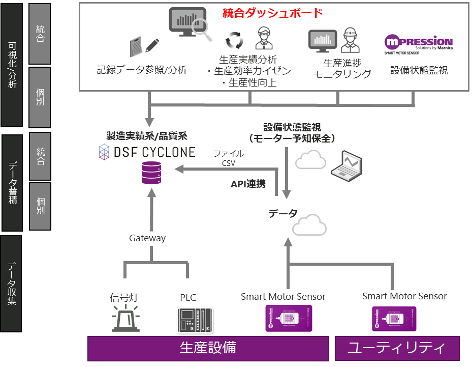そこでこのたび、このような現場課題及び将来のビジョンに向けて、生産状況及び生産効率の可視化、故障予知に特化したSMSデータなどを一元管理する統合型ダッシュボードが実現できる「DSF Cyclone」を組み合わせたマクニカオリジナル総合ソリューションの導入を決めました。
