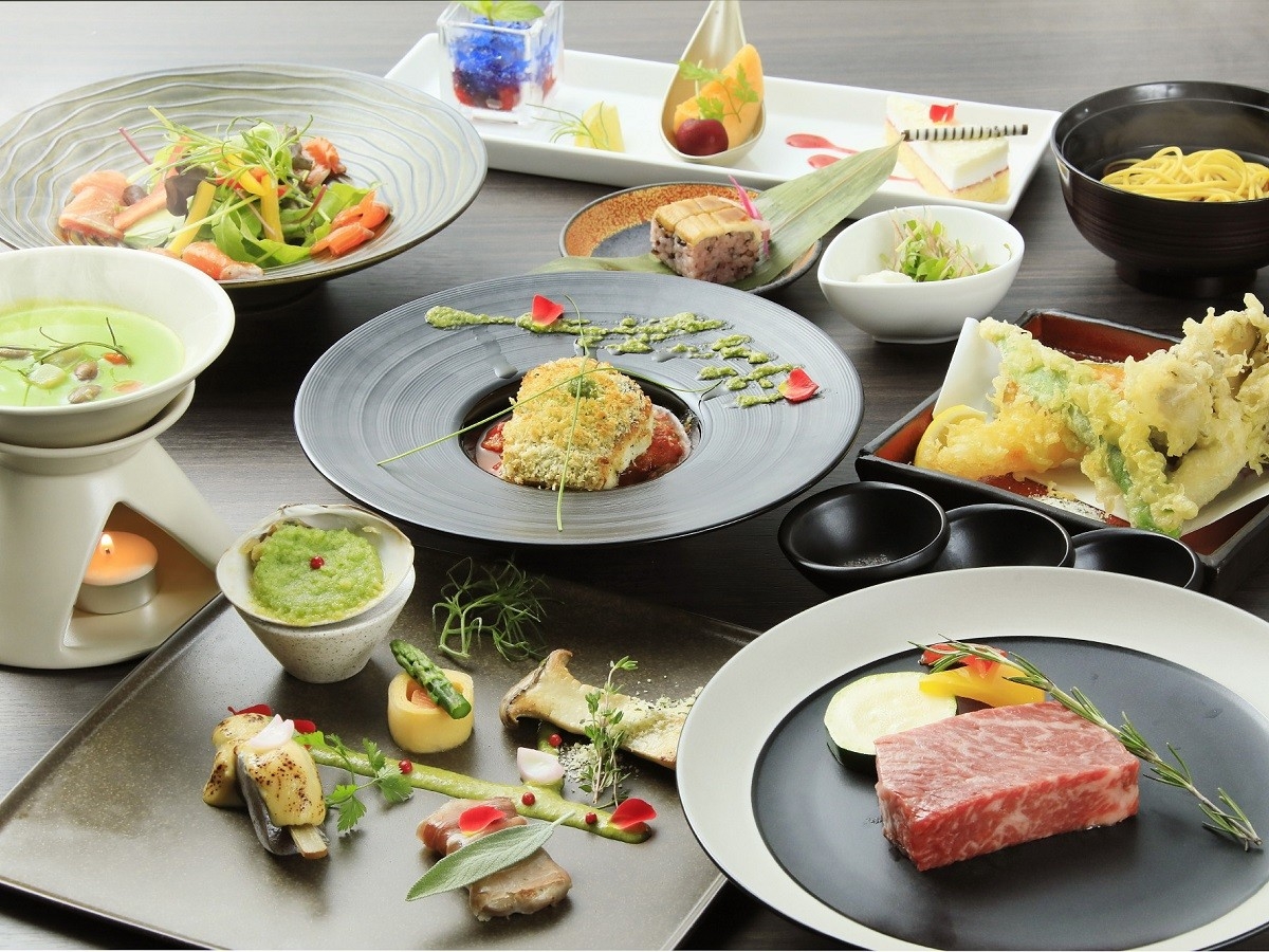 お食事は鉄板焼きをメインとしアクセントに香草使ったこだわりの創作会席を。