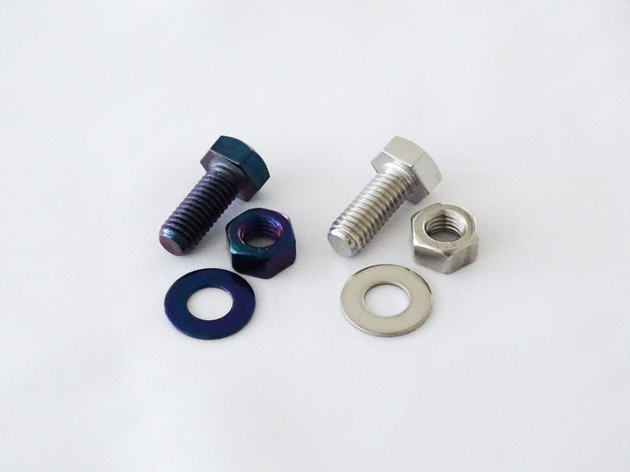 通常のステンレスの色はシルバーですが、酸化発色処理を施すことにより青色(通称:ブルーアイズ)をはじめとする5色に変化させることが出来ます。