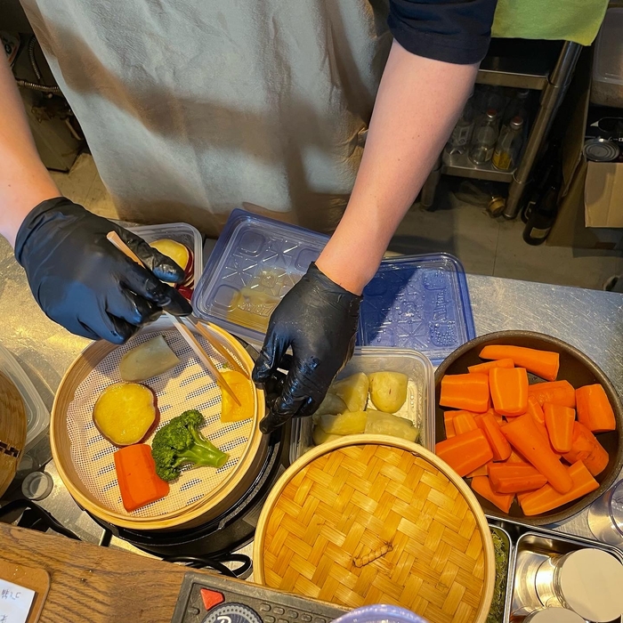 せいろで蒸し立ての大きめ野菜をトッピング。甘味もあって美味いホクホクの産直野菜は店主が鹿児島指宿で感銘を受けた蒸し野菜スタイルです。