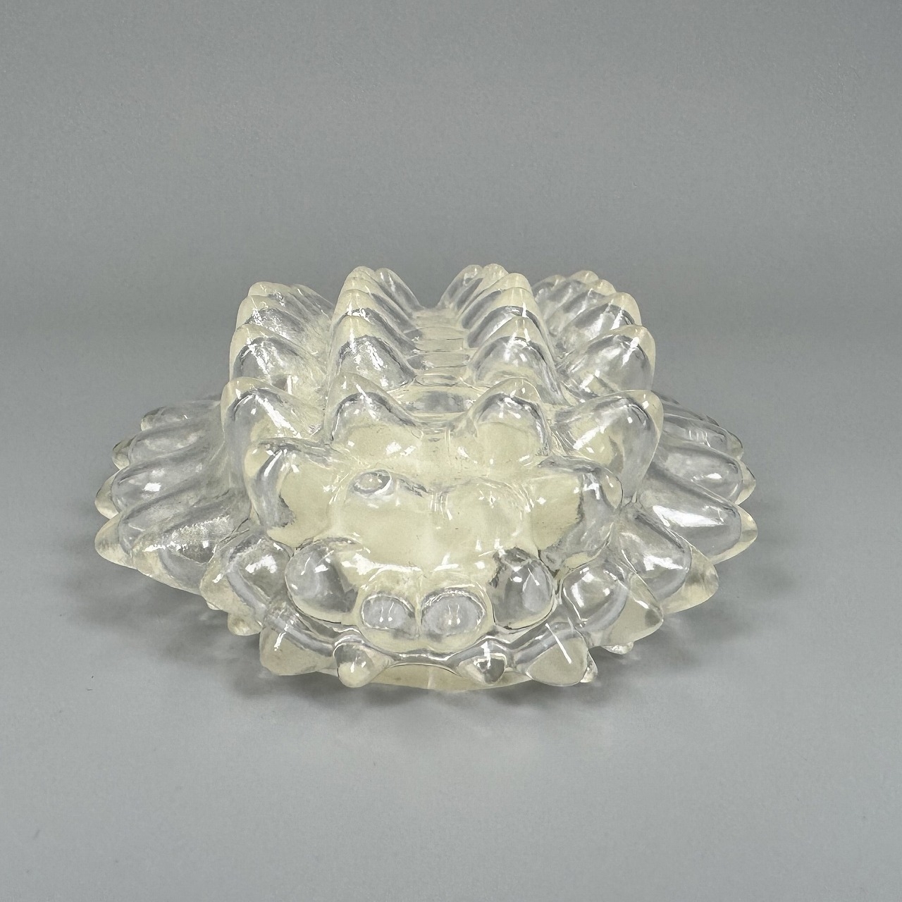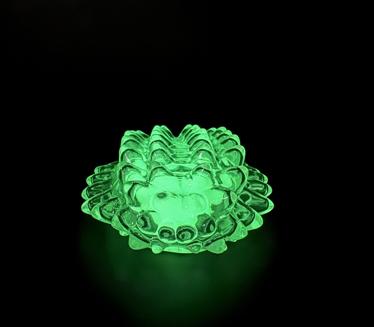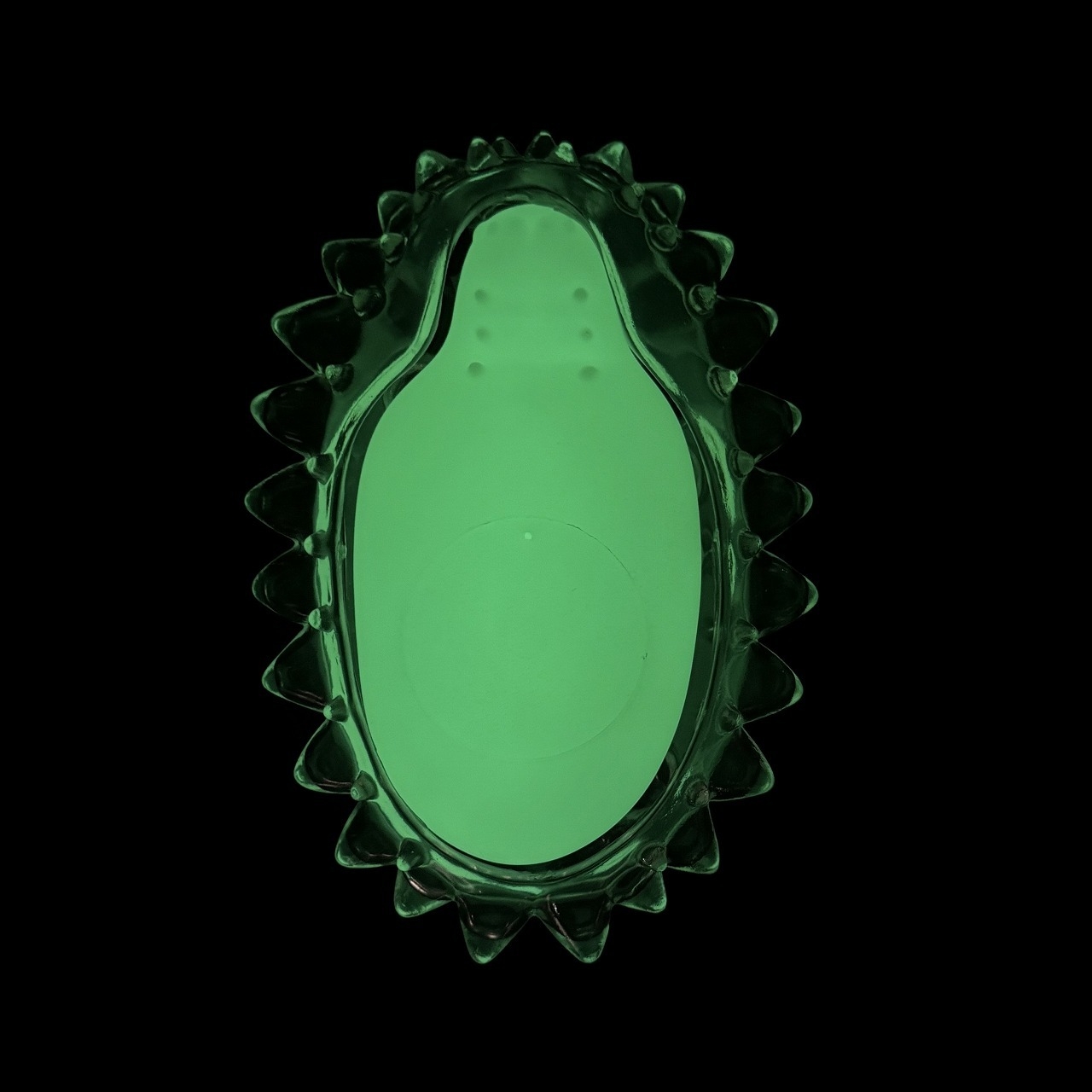 クリア素材で特徴的な粘液を表現し、本体は蓄光ソフビで表現。粘液部分と本体部分は分離した構造。