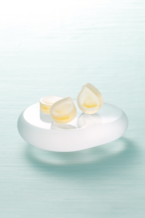 『レモンの雫氷』の上に添えた『琥珀 レモンの雫』は、永楽屋の代表商品である寒天菓子『琥珀』の季節限定品です。爽やかな香りと優しい酸味をもつ、広島県瀬戸田産「エコレモン」を閉じ込めています。