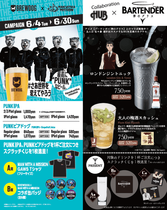 世界的人気を誇るビールBREWDOGとMAN WITH A MISSIONとのコラボレーションにHUBも参加いたします!対象商品のご注文につきスクラッチくじを1枚贈呈いたします。