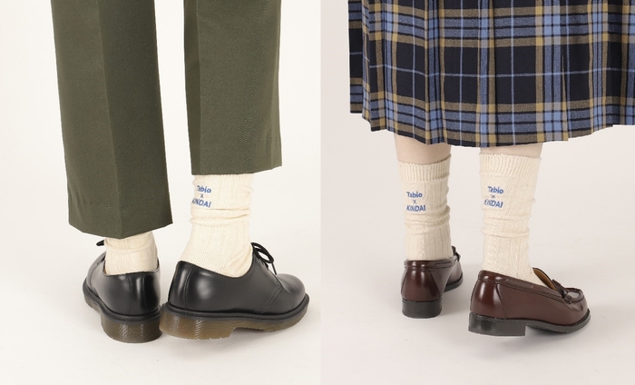 今回の産学連携コラボ靴下は、さらなる商品企画とデザイン開発を進めてきたもので、無農薬コットンそのものの色を残した無染色の綿糸を主素材とし、ベースとなるリブ編み地のクルー丈に、「Tabio×KINDAI」を刺繍しました。23~25㎝と25~27㎝の2サイズを用意しており、令和5年(2023年)3月31日(金)から、Tabio公式オンラインストア、靴下屋なんばパークス店(大阪市浪速区)などで、期間・数量限定で販売します。