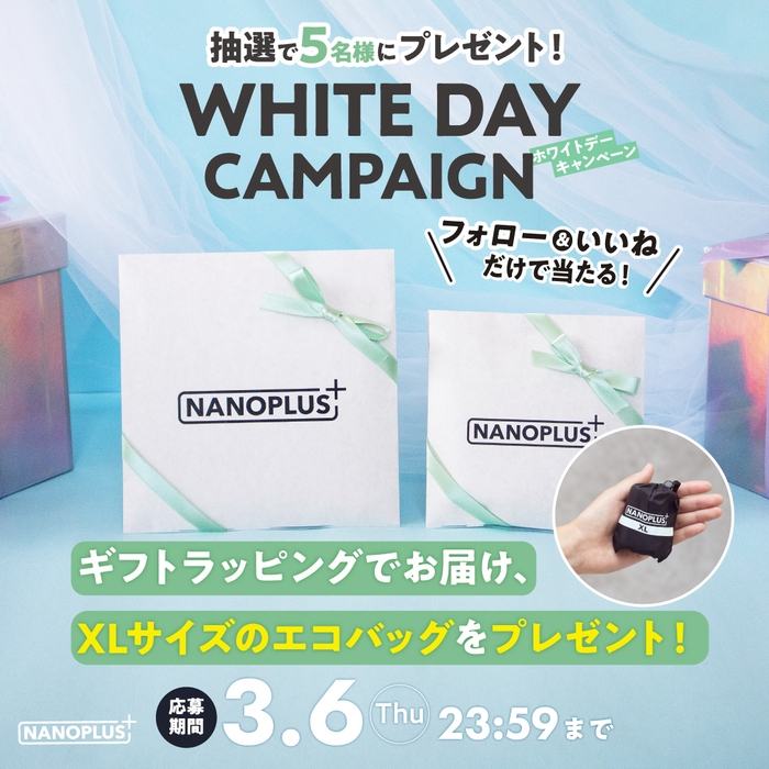 また、同期間にホワイトデーシーズンにあわせてラッピングを施した手のひらサイズのエコバック「NANOPLUS」があたるInstagramキャンペーンも開催します。