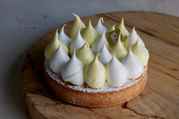 香ばしく焼き上げたタルト生地に、レモン果汁とエシレ バターをふんだんに使ったバター クリームを敷き詰め、白と 黄色の彩り鮮やかなメレンゲを隙間なく飾り付け、粉糖で仕上げました。