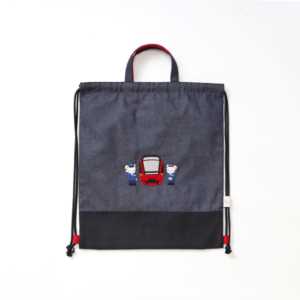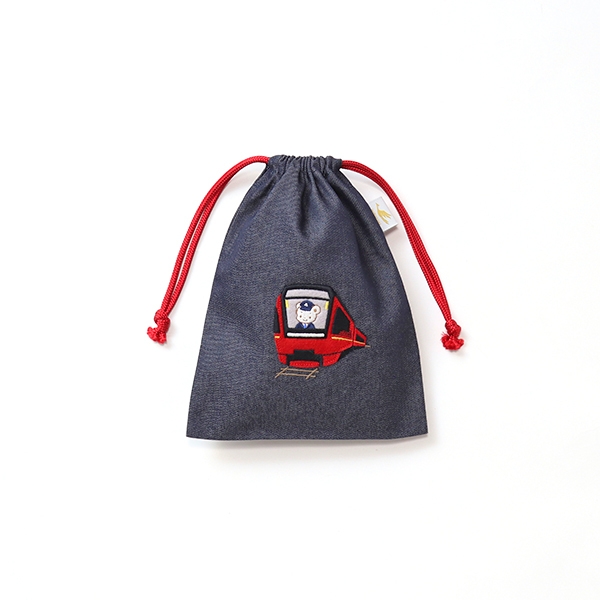 ファミちゃんたちと特急ひのとりのアートのナップサック。巾着タイプで