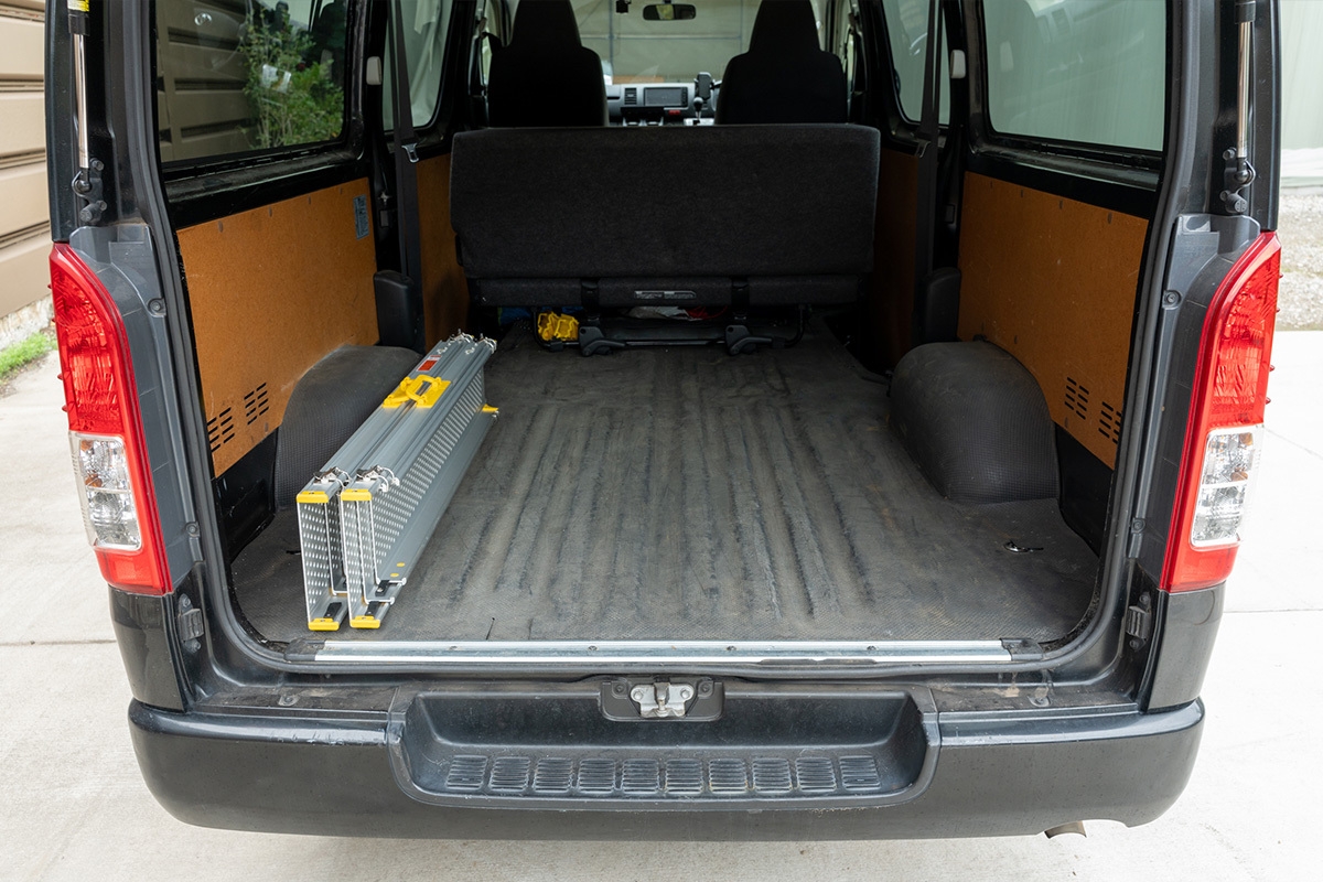 「クロウディ専用伸縮式スロープ」を使えば、機材を載せたまま積み込み・積み下ろしができます。