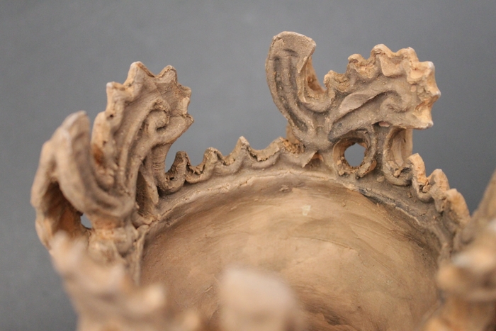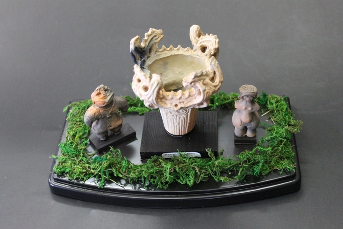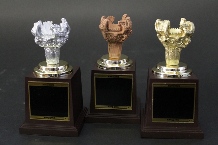 約10年の試行錯誤を得て縄文土器職人の手作り火焔型土器レプリカが完成しました。火焔型土器を製作後、メッキ加工を行い土台を配置し、陶器製の質感と重厚感のある日本独自の優勝カップが完成となりました。