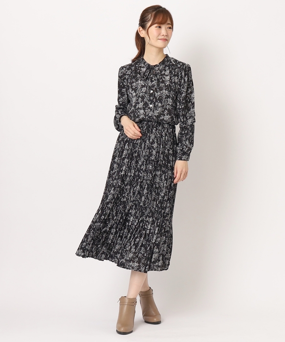 フェミニンなディティールが顔周りを華やかに演出するブラウスとプリーツスカートのセットアップ。