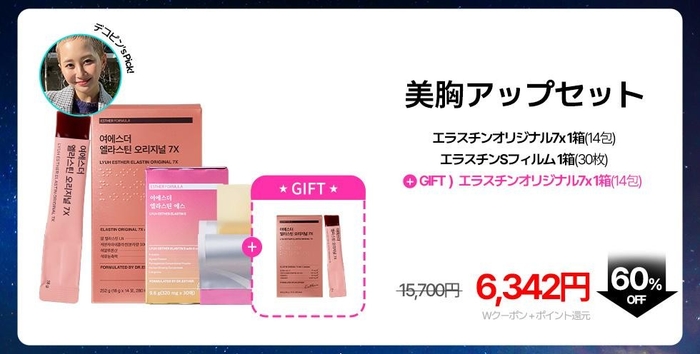 今回のQoo10メガポでは、バストケアに必須のエラスチンセットを販売いたします。このセットは、エラスチンとコラーゲンをおいしく手軽に摂取できる魅力ある内容です。さらに、今ならこのセットをお買い上げいただいたお客様全員に「ヨエスターエラスチンオリジナル7X 1箱」をプレゼントいたします。 ぜひこのチャンスをお見逃しなく、ご自身の美をサポートしてください!
